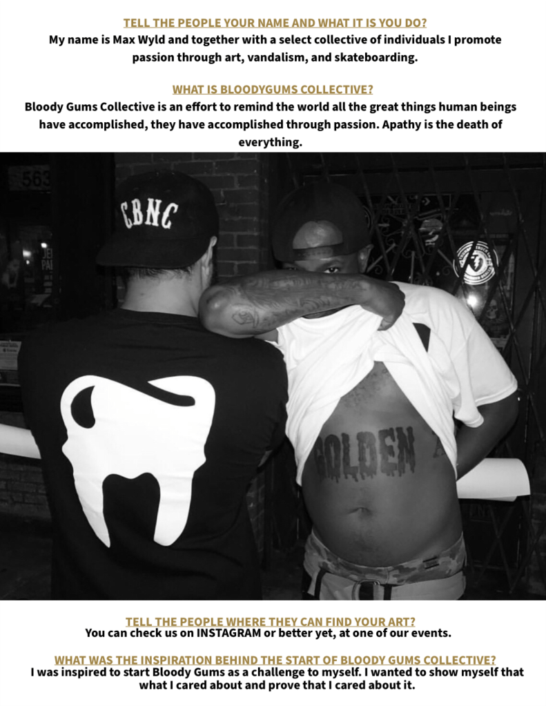 The man with a few faces and a name to go with each one of them. I’ll just reference him as Max Wyld. He’s responsible for the Kasino Gang logo. One summer I kept seeing this tooth pop up everywhere I was. So I knew it was one of the close homies.